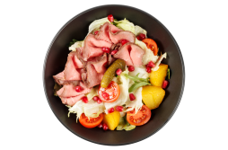 Нежный ростбиф с айсбергом и рукколой, картофелем, черри и корнишонами, с заправкой из оливкового масла, лимона и горчицы, с зернами граната