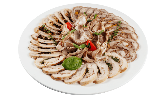 Буженина из свиной шейки, рулет из кролика с черносливом, куриный рулет со шпинатом и сливками, рулет куриный с курагой.