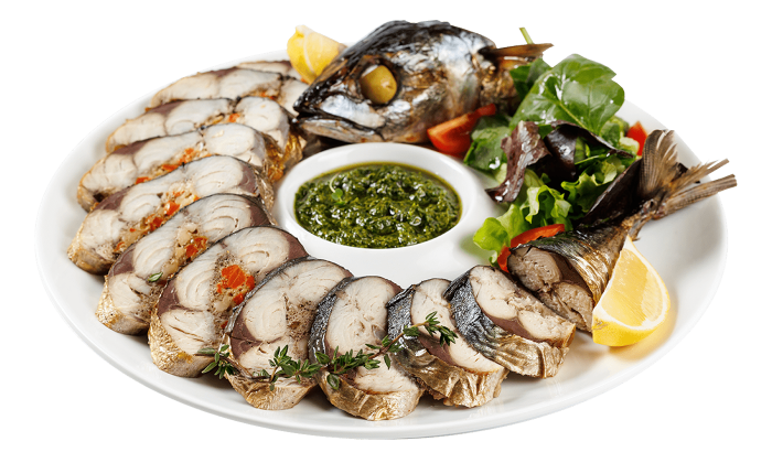 Сочная скумбрия, наполненная ароматной смесью сыра и свежих овощей, запечённая до румяной корочки.
