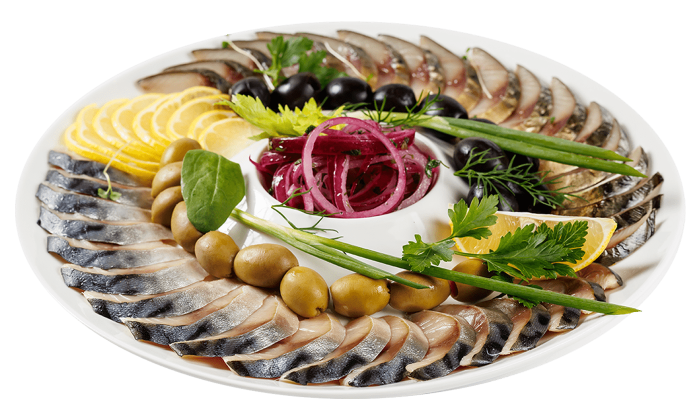 Скумбрия слабого посола, скумбрия подкопчённая, маринованный красный лук, оливки , маслины, лимон