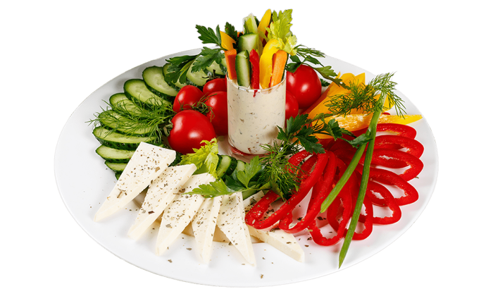 Огурец, томаты черри, сладкий перец, брынза, стебель сельдерея, морковь, соус тар-тар, пряная зелень.