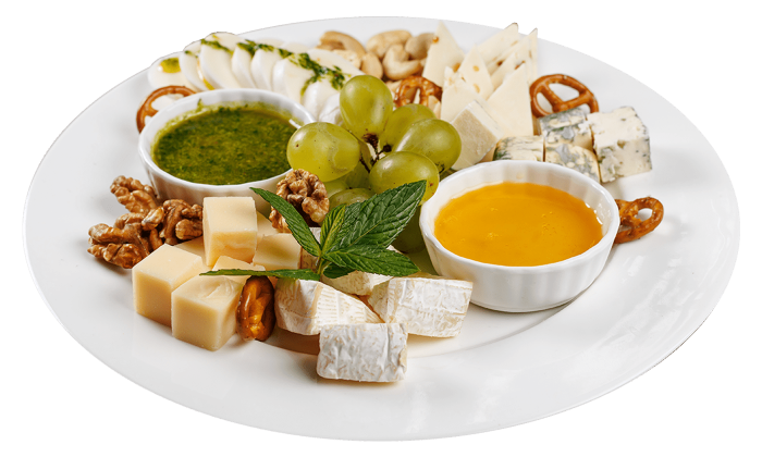Ассорти сыров: дорблю, пармезан, качотта, бри , моцарелла. Подаётся с виноградом, мёдом и хрустящими грецкими орехами и миндалём.