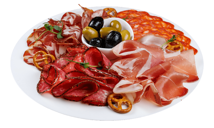 Ассорти из чоризо, прошутто, элитной шейки и салями мадера. Подаётся с маслинами, оливками.