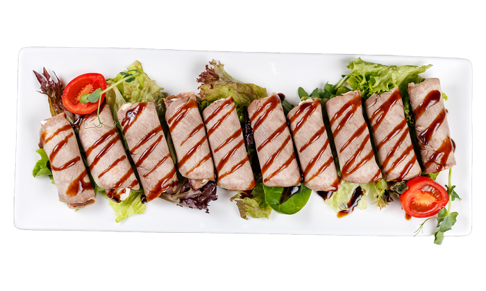 Рулеты из говяжьего языка, с начинкой из сливочного сыра и соуса тар тар.