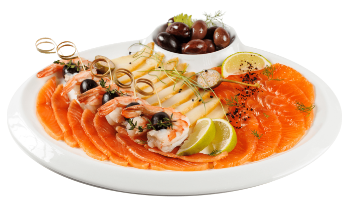 Лосось слабого посола, лосось холодного копчения, масляная рыба, креветки тигровые, лайм, маслины, оливки .