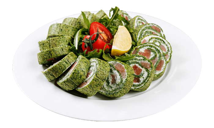Шпинатный рулет с кремом из сливочного сыра и кусочками слабосолёной сёмги.