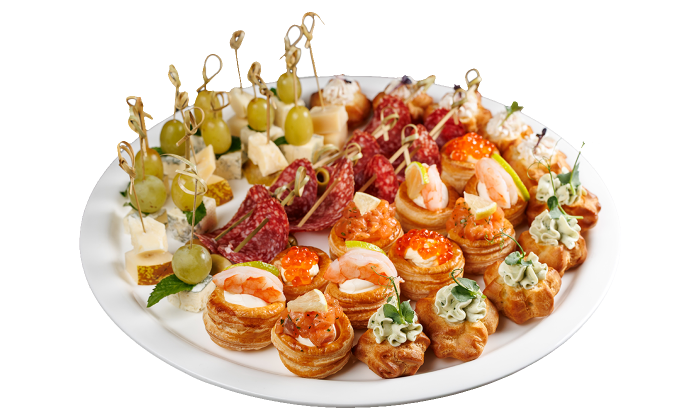 Волованы с икрой, с креветкой, с лососем, профитроли с ветчиной, профитроли со сливочным сыром и чесноком, канапе с сыровяленой колбасой, канапе с сырами и ягодами.