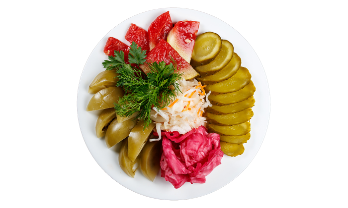 Как у бабушки в деревне: малосольные огурчики, две капусты — квашеная и маринованная, зелёные помидоры, мочёные яблоки и сладковатый арбуз