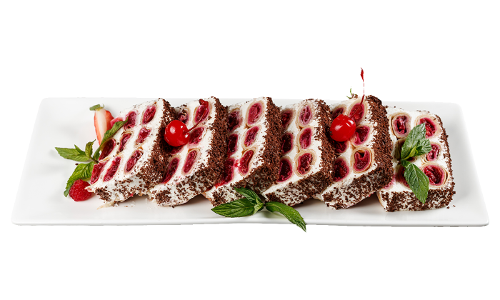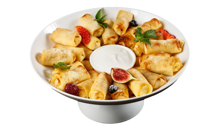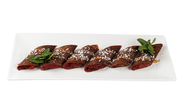 Блины с начинкой из вишневого соуса с кремом на основе сметаны и сливок.