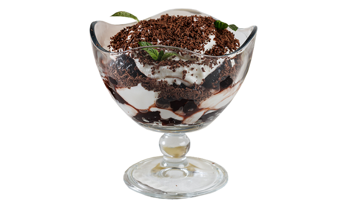 Чернослив с грецким орехом, тушеные в красном вине, со сметанным кремом и черным шоколадом.