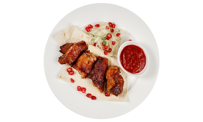 Сочный шашлык из курицы на углях — ароматное мясо с румяной корочкой, подаётся с луком, лавашом и томатным соусом.
