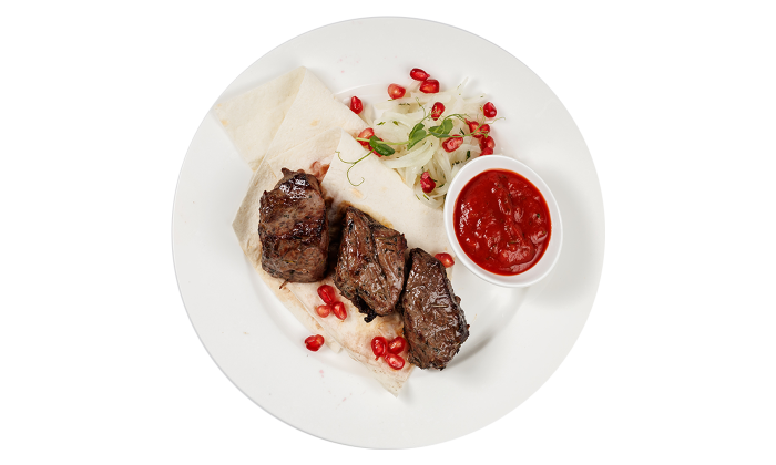 Сочный шашлык из говядины на углях — ароматное мясо с румяной корочкой, подаётся с луком, лавашем и томатным соусом.
