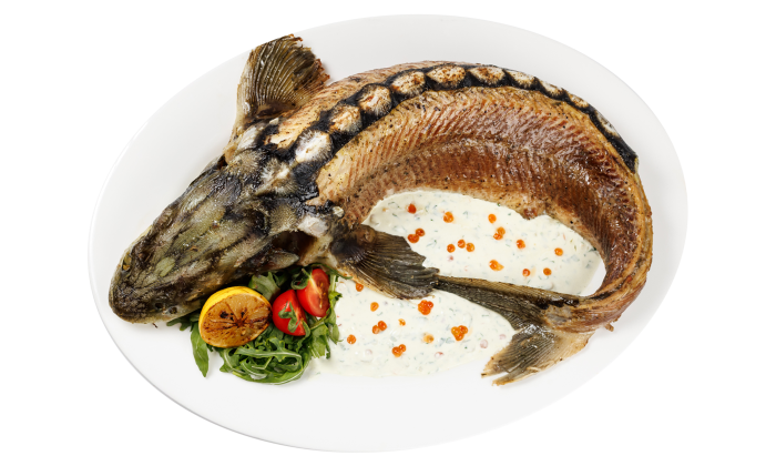 Подкопчённый осётр, сохраняющий натуральную сочность и насыщенный вкус, подаётся с изысканным сливочно-икорным соусом.
