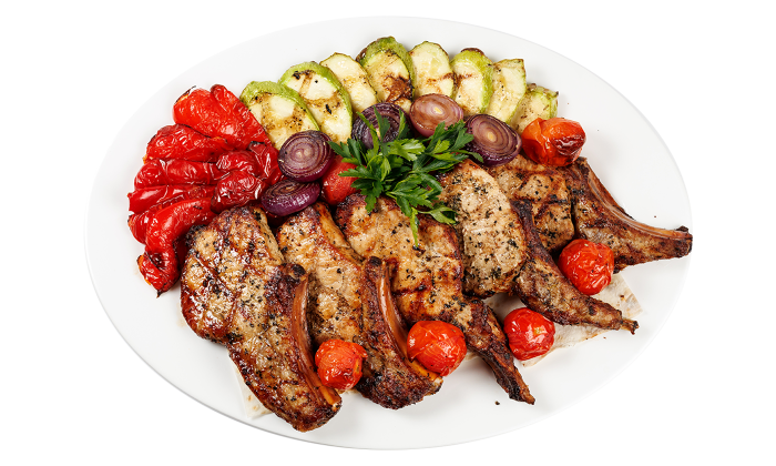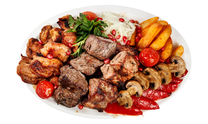 Шашлык свиной, шашлык куриный, мини люля говяжий, купаты, стейк из свиного ошейка, овощи гриль, соус томатный, лук маринованный, зелень, зерна граната.