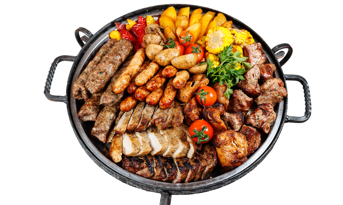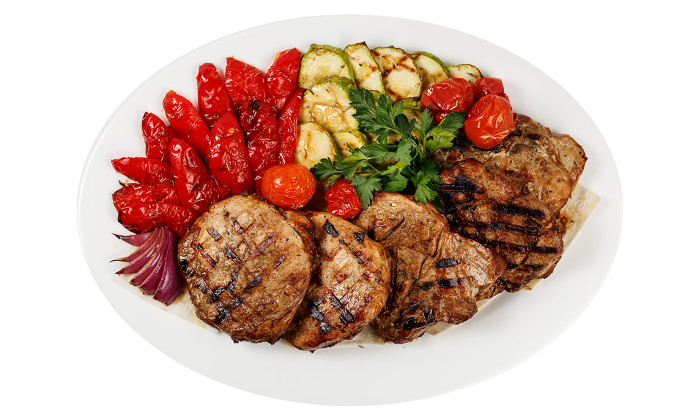 Сочная курица, ароматная свинина и пряная говядина, приготовленные на углях, подается с овощами гриль и томатным соусом.
