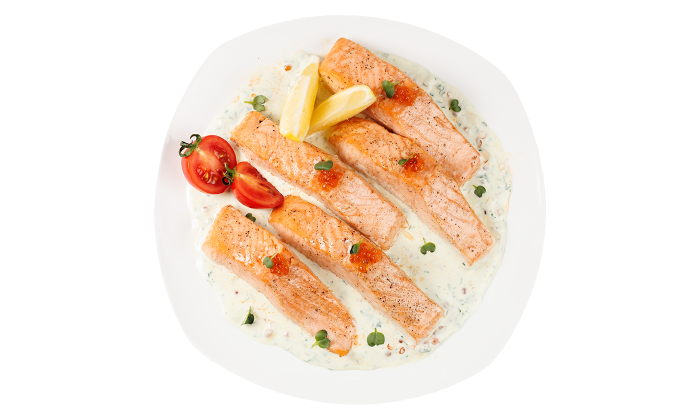 Нежное филе сёмги, запечённое до идеальной сочности, подаётся с деликатным сливочно-икорным соусом.