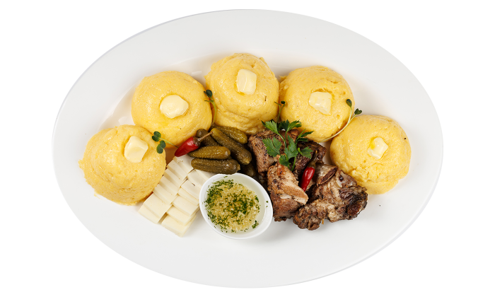 Традиционная мамалыга, подающаяся со свиными рёбрышками, овечьей брынзой и пикантным муждеем.