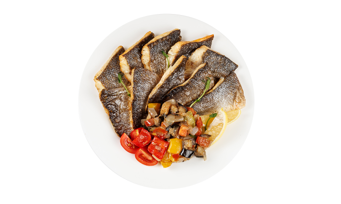 Сочный сибас с хрустящей корочкой, обжаренная на гриле. Подаётся подается с овощным рататуем и лимоном.