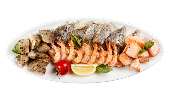 Нежное ассорти из филе осетра, лосося и дорадо, дополненное тигровыми креветками.