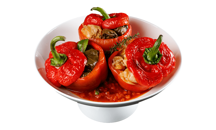 Сочные голубцы, начиненные нежной мясной и рисовой начинкой в виноградных листьях/крыжалке, томятся до идеальной мягкости, подаются в сладком перце.
