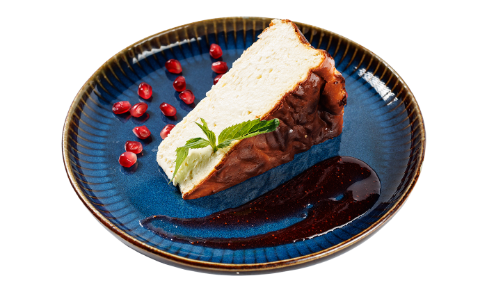 Чизкейк, карамелизированная корочка, подается с вишневым соусом