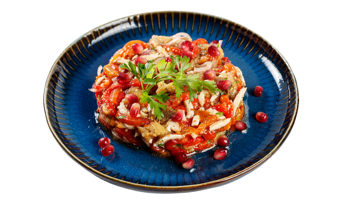 Нежное куриное филе, запеченные баклажан и сладкий перец, грецкий орех, свежая зелень