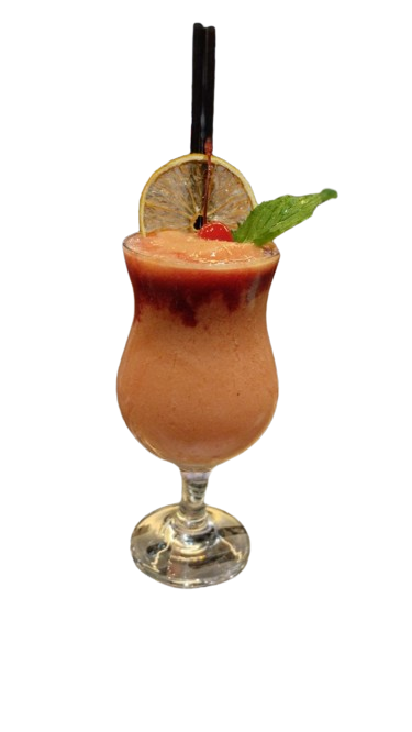 Peach juice, strawberry syrup, banana, pomegranate syrup, strawberries.