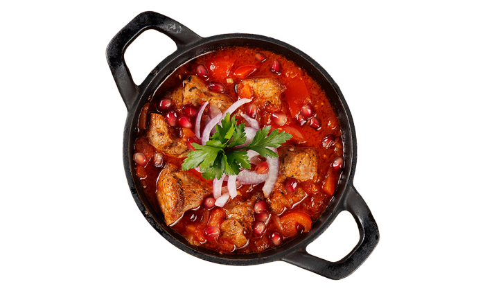 Томлённый в печи молочный ягнёнок, овощи гриль, подается с фирменным томатным соусом, лавашом и лепешкой.